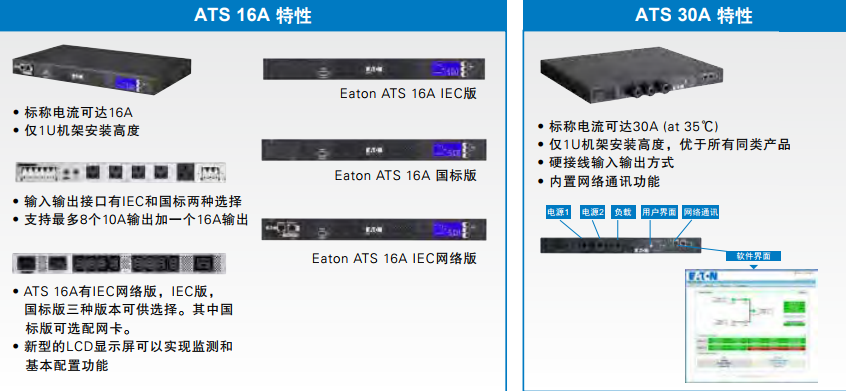 伊顿 ATS 单相电源转换开关,供给低成本解决方案,帮助客户为交换机和路由器等网络设备增加电源冗余功能。 伊顿ATS电源转换开关这种自动转换开关可从两个不同的电力来源供电。如果一个断开,另一个会自动接通,所连接设备的供电不会中断。伊顿 ATS 可同时连接多台设备,省去冗余供电设备的高昂成本。 ATS 16 Netpack 和 ATS 30 具备网络连接功能。用户可以远程访问、配置和管理装置;1U 机架式外形;通过 ATS 16 LCD 提供计量和配置功能。 ![]() ![]() ![]() |