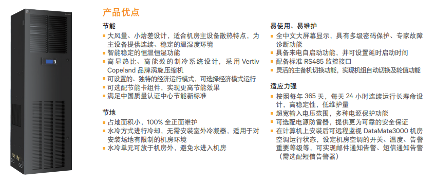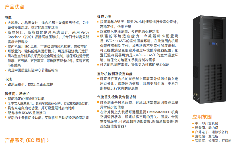 艾默生精密空调DataMate3000系列高能效型机房专用空调专门针对高能效需求的场所设计。 艾默生空调DME系列高能效机型室内机采用了高效节能的EC风机, 并对压缩机、膨胀阀等进行了针对性的调校,使其在普通DataMate3000的基础上进一步节能10%以上。高能效机型可应用于要 求高能效的中小型计算机机房、电源室、精密控制室等场所,具有超高能效比、稳定、长寿命运行的特点,可有效降低机房的环 境控制的总体拥有成本(TCO),产品获得中国节能产品认证证书。 ![]() ![]() ![]() ![]() . 艾默生Liebert®DataMate3000系列风冷型机房专用空调 DataMate3000系列风冷型专用空调可应用于中、小型计算机房、设备间等场所的精密环境调节,机组采用先进的设计理 念,经过精密空调专业实验室严格测试,具有高效节能、稳定、长寿命的运行特点,并且具有恒温恒湿调节功能,产品获得中国 节能产品认证证书,可满足IT、电力、交通等不同行业的精密环境调节需求。 ![]() ![]() 艾默生Liebert®DataMate3000系列17KW风冷型专用空调 DataMate3000系列17kW机房专用空调可应用于中小型计算机机房、电源室、精密控制室等场所的精密环境调节,具有高效 节能、稳定、长寿命等运行特点,具有恒温恒湿调节功能,并采用了室外无极调节控制、远红外加湿系统、R410A环保制冷剂等 多种先进技术,产品获得中国节能产品认证证书,可满足IT、电力、通信、交通、金融等不同行业的精密环境调节需求。 ![]() |